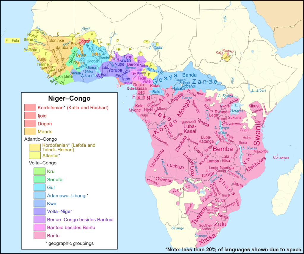 The largest language family of the four and contains between 1350-1650 languages. The most widely spoken languages of Africa, Swahili (200 million), Yoruba (45 million), Igbo (30 million), and Fula (35 million) all belong to the Niger-Congo family (Harvard, 2024).